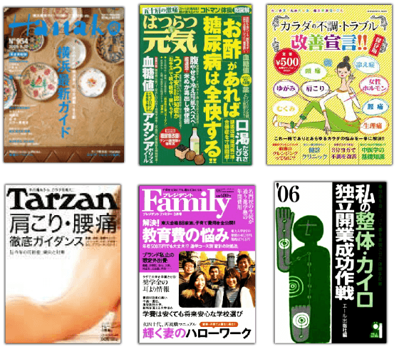 『私の整体・カイロ独立開業成功作戦』、『プレジデントファミリー』、『Hanako』、『Tarzan』、『はつらつ元気』、『大人女子のための悩み・痛み解決BOOK カラダの不調・トラブル改善宣言!!』、他。