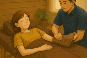 施術では、首や肩、鎖骨まわりの筋肉の緊張を丁寧にゆるめながら、 背中や肋骨の動きをやさしく整えてもらいました。
