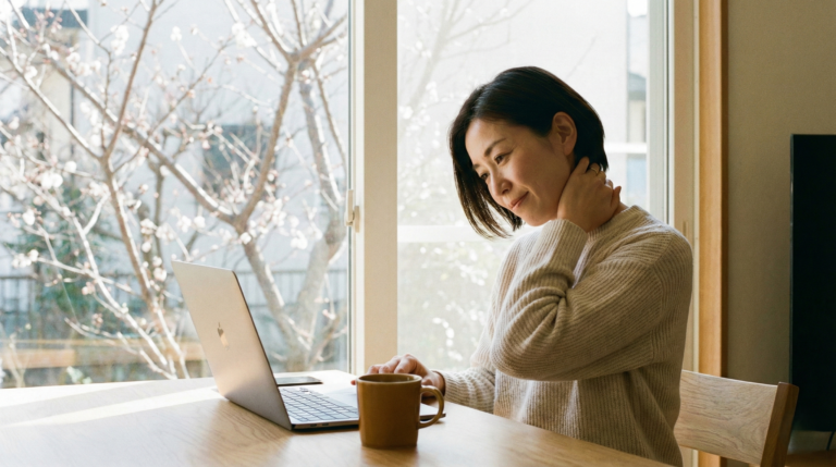 ホットアイマスクで目元を温めるだけでも、後頭下筋群の緊張は少し和らぎます。また、花粉症対策としてマスクをする際も、耳にかかるゴムの刺激が首の横の筋肉(胸鎖乳突筋)を硬くさせ、頭痛を助長することがあります。時々マスクを外し、首を優しく回す習慣をつけてみてください。