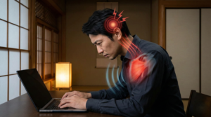 画面に吸い込まれるような猫背。40代デスクワーカーの「肩こり予備軍」は、鎖骨の下の固まりで呼吸が浅くなっているかも