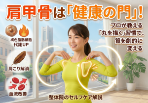 こんにちは。横浜・石川町駅近くのもとまち整体院、院長のおおやです。 日々、多くの方のお体を拝見していると、ある共通点に気づきます。それは、肩こりや慢性的な疲れを感じている方のほとんどが、「肩甲骨がガチガチに固まっている」…